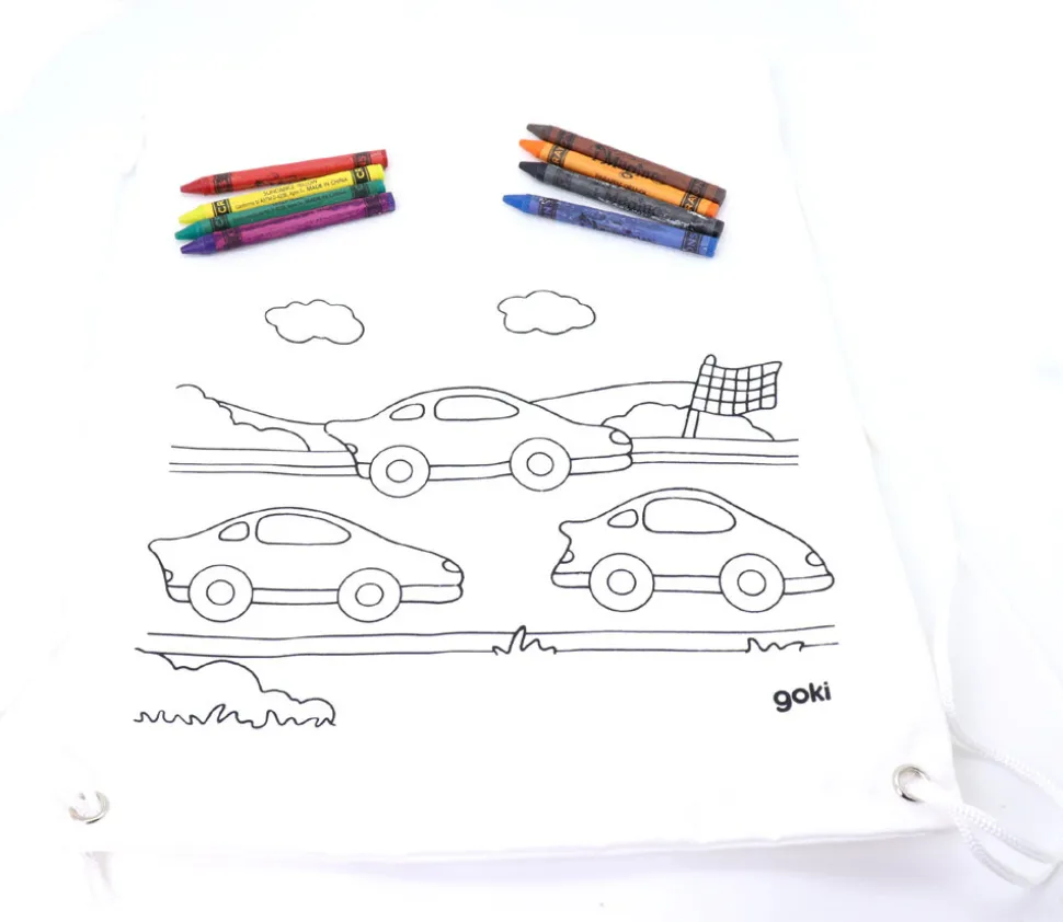 Sac à dos en tissu avec un dessin en noir et blanc d’une course de voitures à colorier grâce aux 8 crayons gras pour textiles fournis. Comme un sac de sport vous pourrez transporter vos jeux préférés dans ce sac à serrage par cordelette.