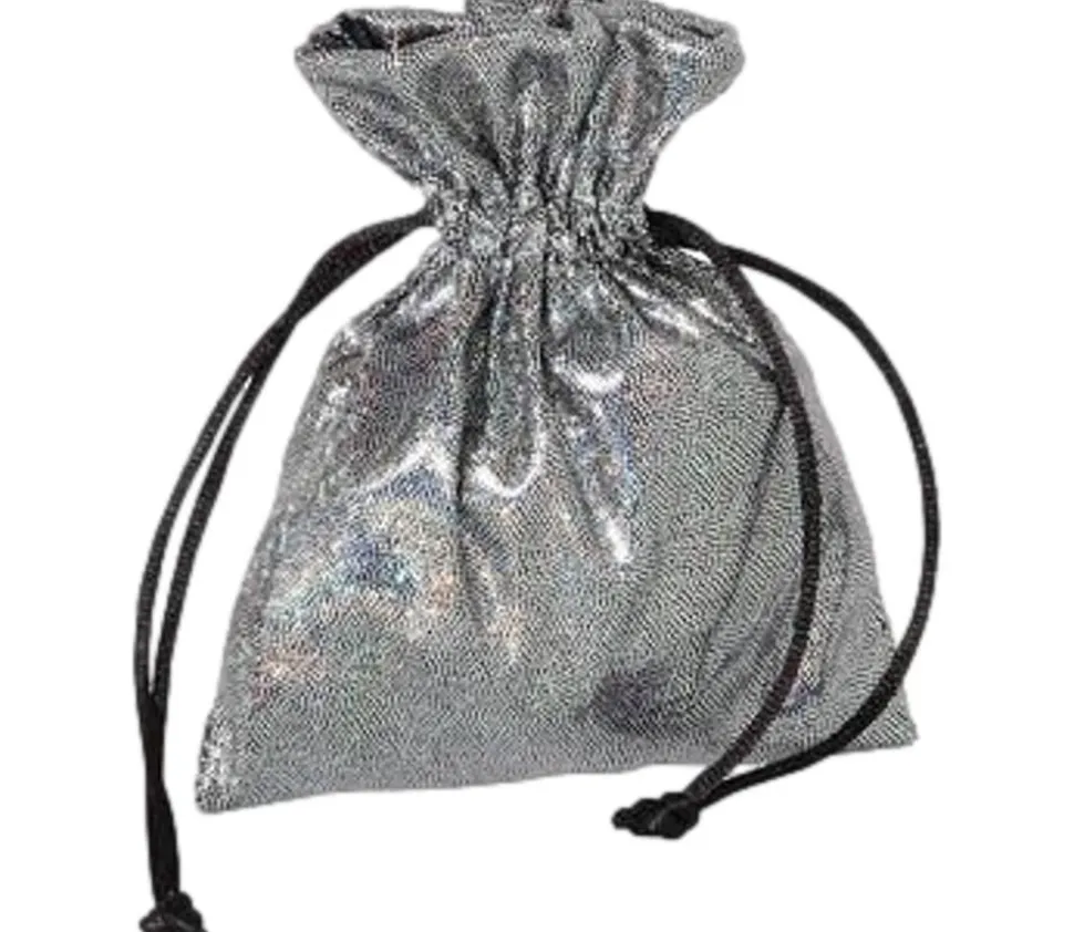 Petite bourse brillante argentée pour ranger vos accessoires de jeux ou pour offrir un bijou précieux….
