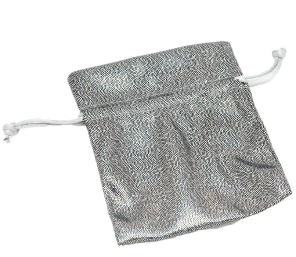 Dimensions du sac bourse argenté : 100 x 125 mm.
