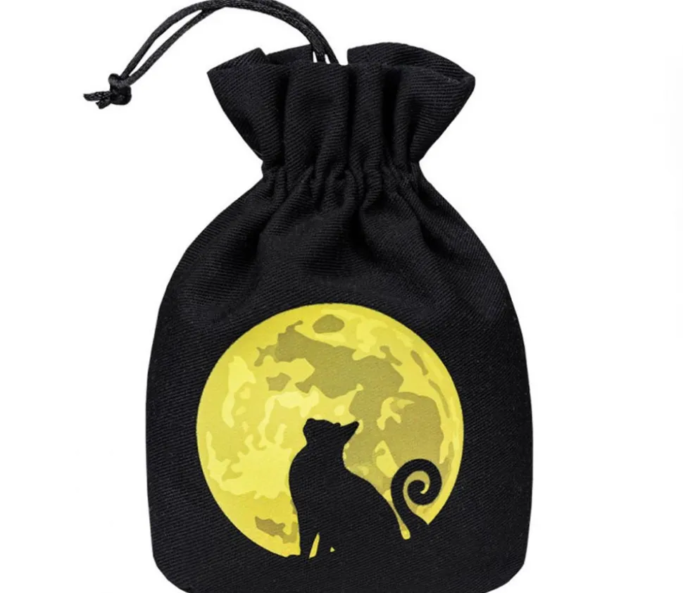 Pochon en tissu noir avec illustration d’un chat devant la pleine lune.