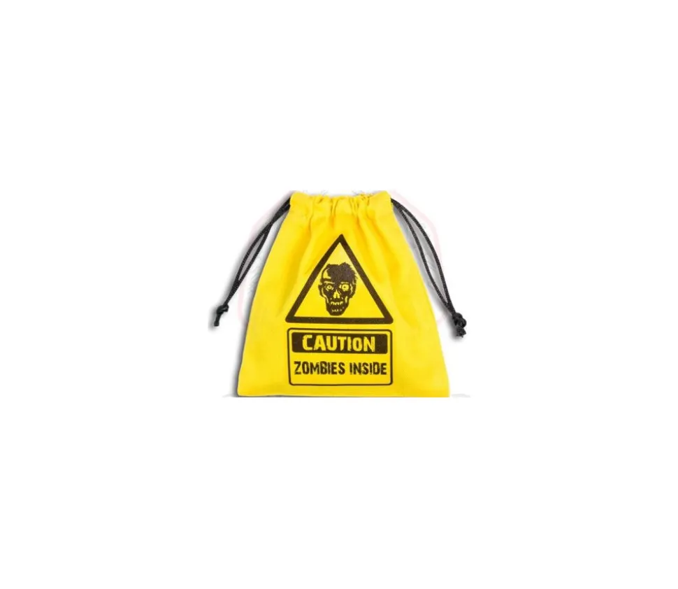 Sac de jeu 11 x 11.5 cm avec tête de mort noire et inscription Zombies inside. poche en tissu pour ranger vos dés et accessoires. ficelle de serrage noire en haut du sac. Sac de rangement en tissu jaune avec inscripion en noire, idéales pour accessoires de jeux de rôle.