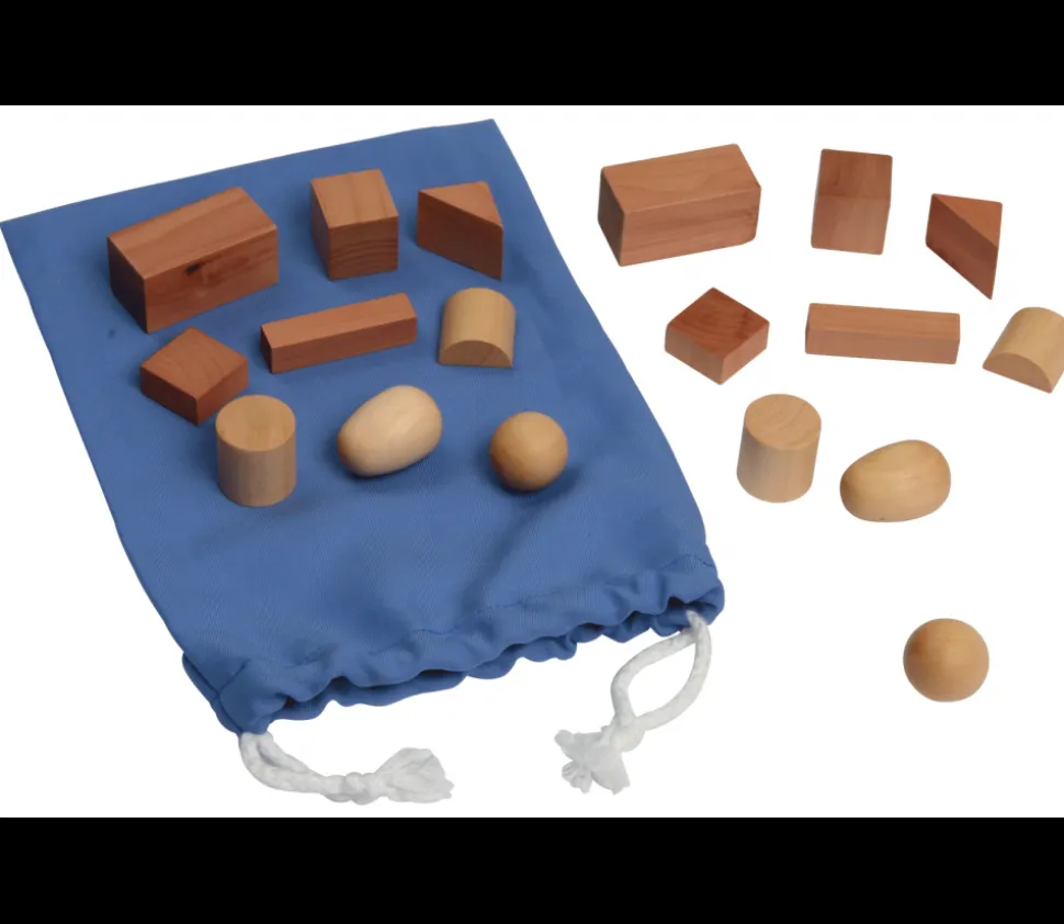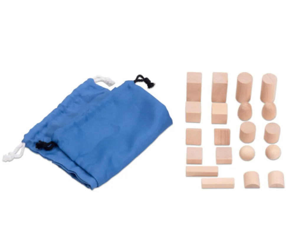 Jeu tactile Montessori. Essayez de retrouver les formes géométriques identiques avec le sens du toucher. Piocher avec sa main dans le sac pour essayer de retrouver les pièces. Matériel pédagogique pour travailler le sens du toucher. Beau matériel avec des formes de qualité : 20 pièces. 2 x 10 formes différentes : cubes, pavés, cylindres, boules, barres, oeufs…