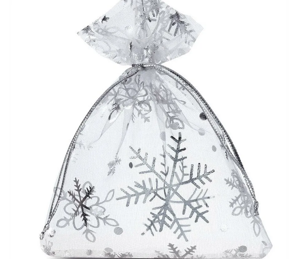 Pochon transparent qui laisse entrevoir le contenu du pochon à travers les flocons de neige (blanc et argent).