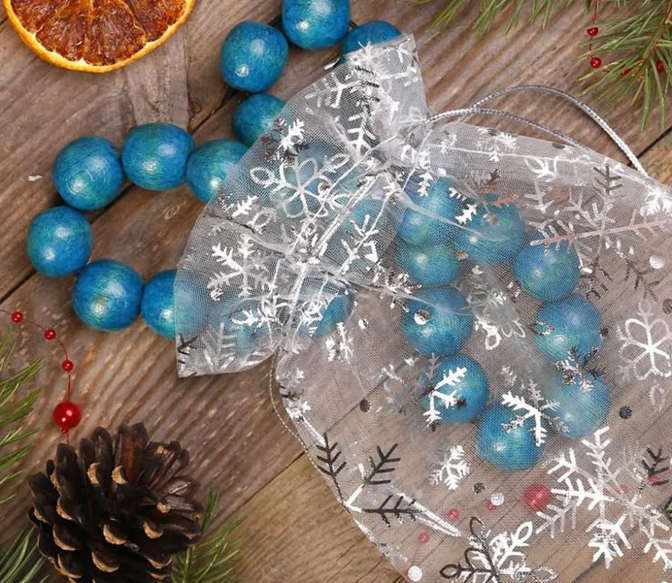 Sachet en tissu transparent organzine blanc avec un décor de flocons. Un joli petit sachet de 9 cm de large et 12 cm de hauteur. Petits cordons argentés coulissants pour la fermeture.