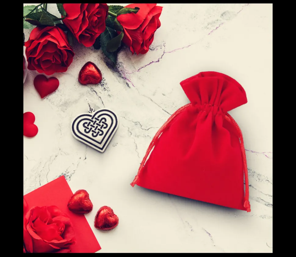 Sachet en tissu rouge en suédine. Un joli petit sachet de 8 cm de large et 10 cm de hauteur.