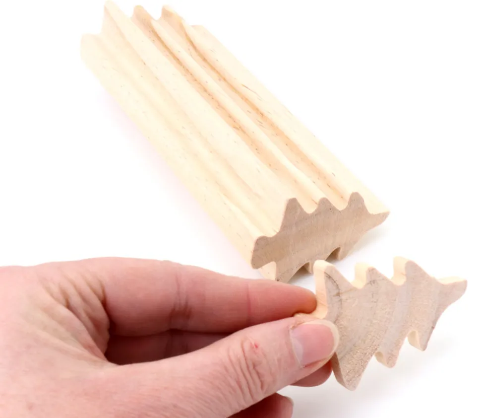 Moulure à découper avec une scie pour faire de petits sapins en bois naturel.