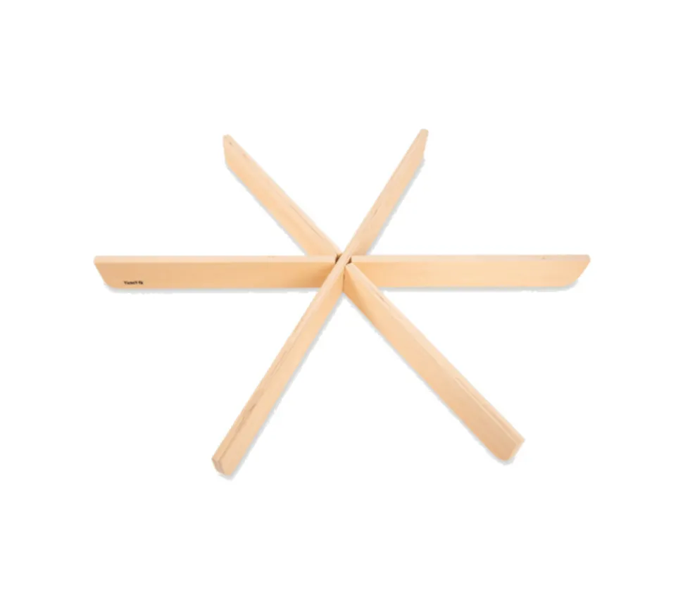 3 barres en bois contreplaqué de bouleau de 64 cm de longueur, 5 cm de hauteur et 1.2 cm d’épaisseur. Les barres ont des encoches au centre pour l’assemblage et ainsi former une croix à 6 branches stable posée sur une table.