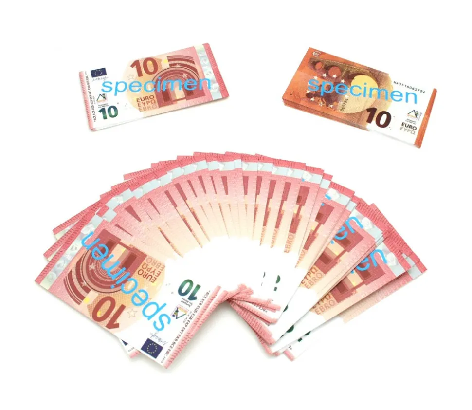 Faux billets de banque de 10 euros pour jeux de société. 100 billets de 10 euros pour jouer pour vos jeux, une liasse de billets factices impressionnante.Billets très réalistes avec une texture qui donne vraiment l’impression de jouer avec des vrais mais c’est écrit en gros dessus specimen. Dimension des billets de 10 euros : 10.5 x 5.7 cm.