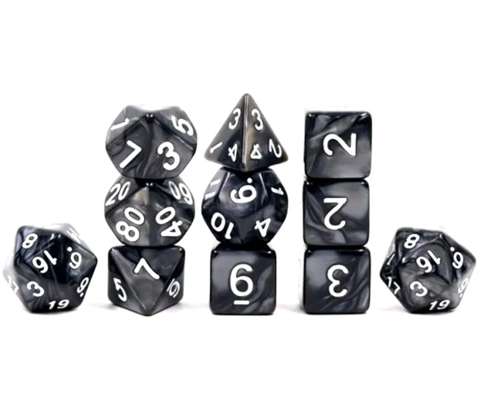 Le set comprend 11 dés multi-faces nacrés noirs dans un sachet zip :