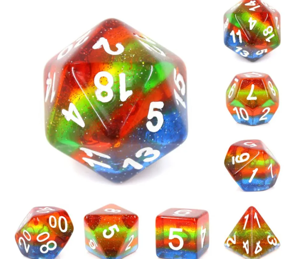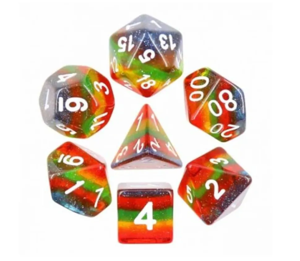 Lot de 7 dés à jouer multi-faces arc-en-ciel avec paillettes. Dés translucides multicolores style arc-en-ciel : violet, rouge, vert, jaune, orange, bleu avec mini paillettes à l’intérieur.