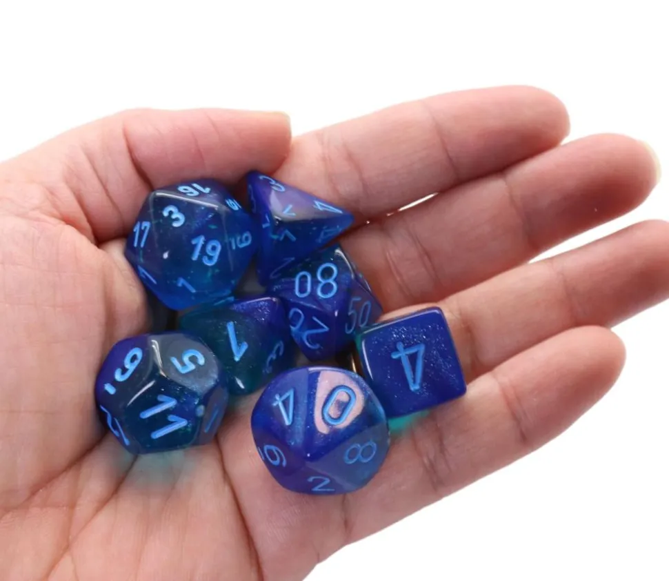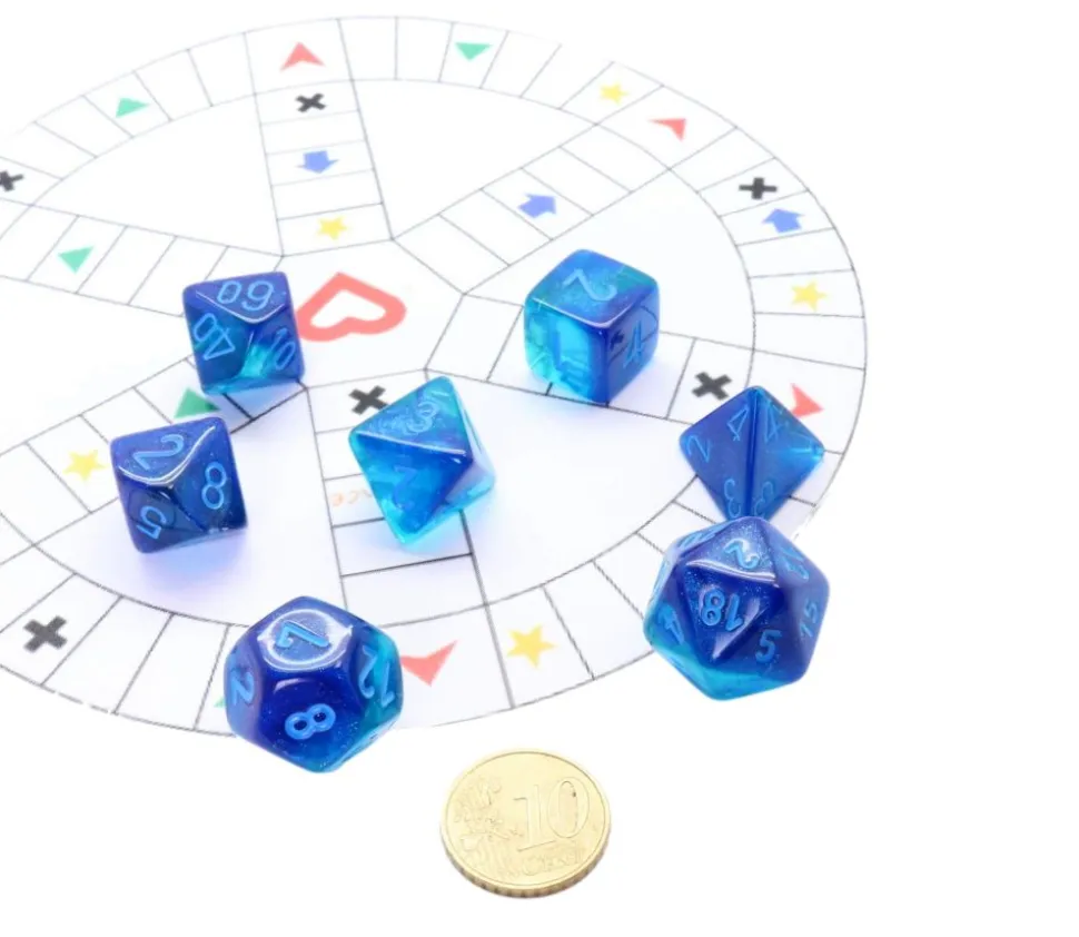 Set de 7 dés à jouer multifaces bleu pailleté. Effet translucide. Chiffres en bleu clair.