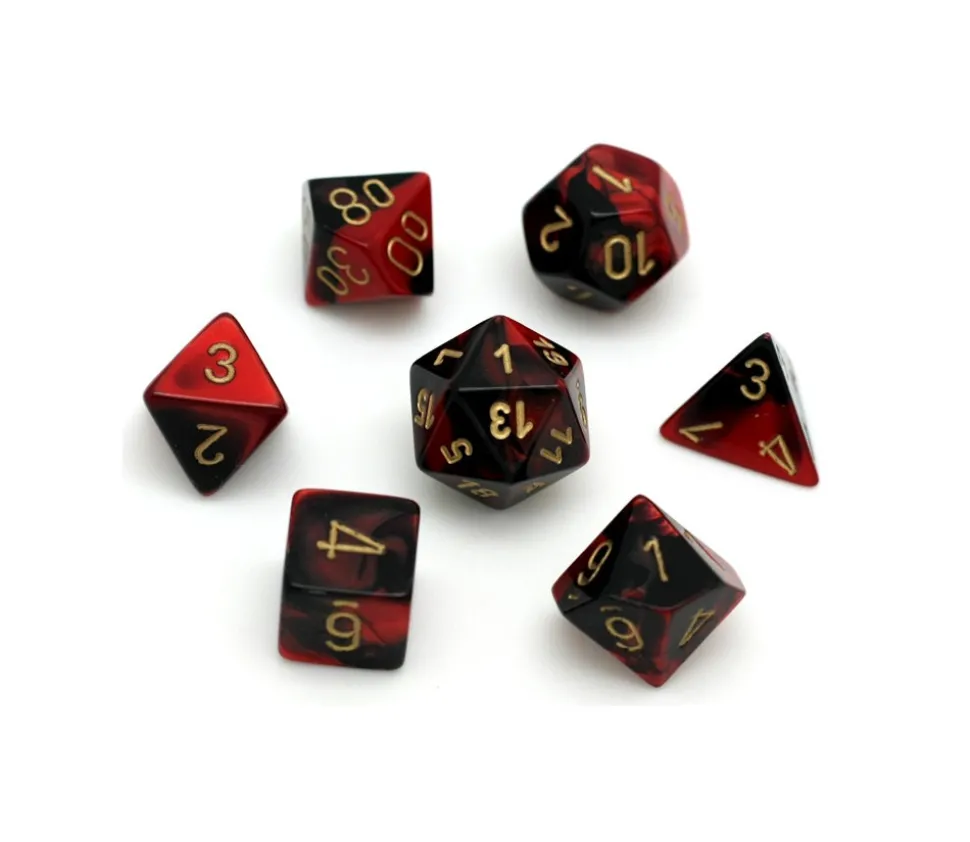 Le set de 7 dés multifaces métallisé noir et rouge comprend :