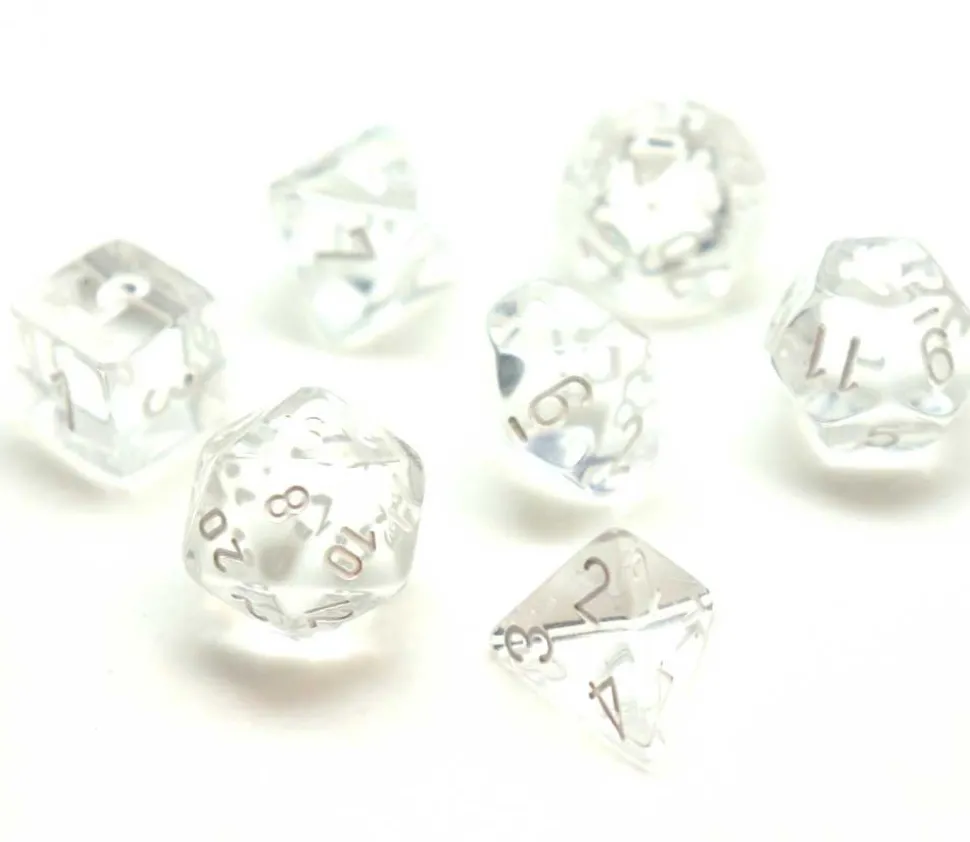 Set de dés multifaces de couleur translucide.