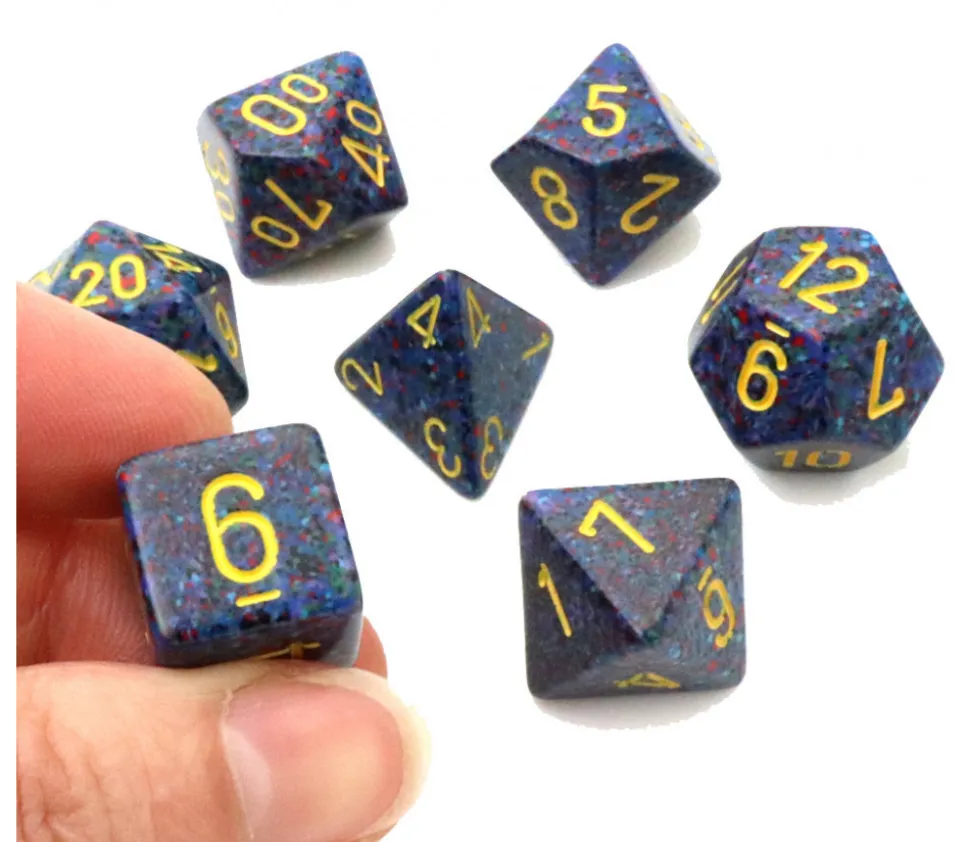 Set de 7 dés à jouer multifaces effet speckled Twilight couleur mélangée bleu, rouge et violet chiffres en jaune.