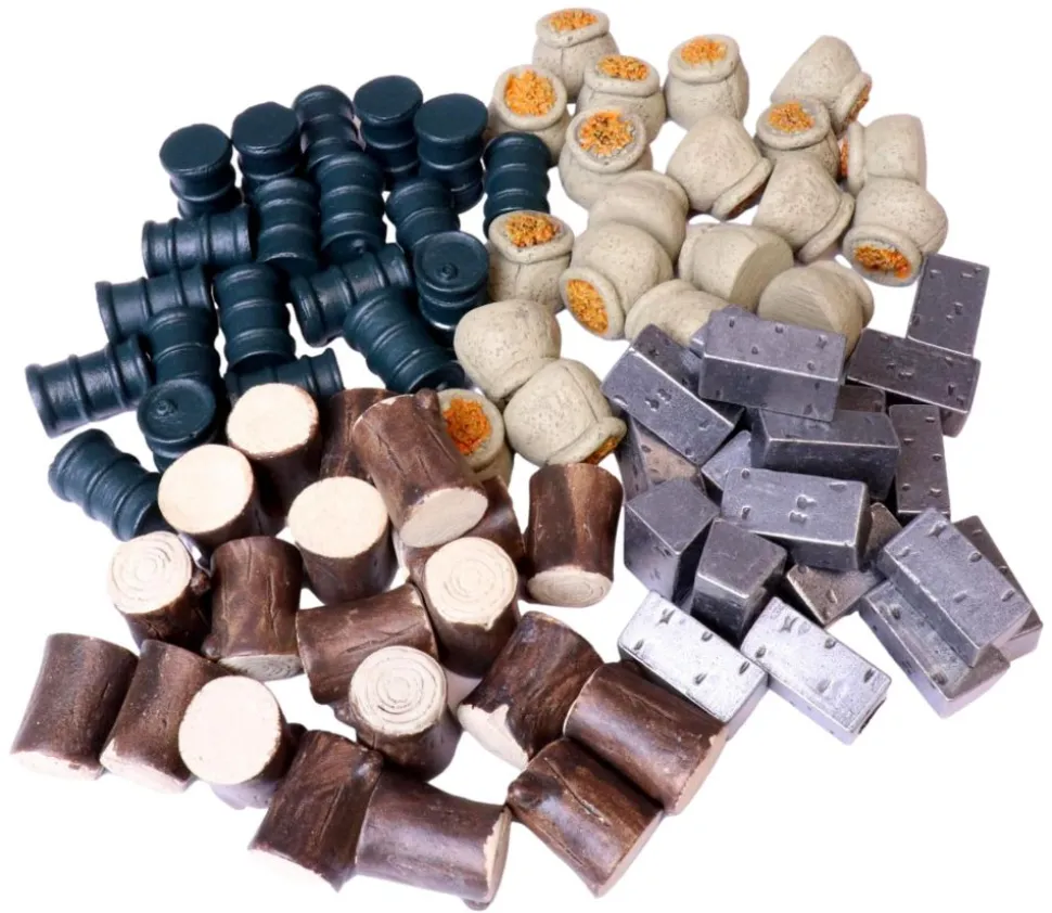 80 pions ressources en résine et métal selon le jeton pour vos jeux de plateau et de stratégie. Ces jetons représenteront les matières premières de 4 sortes différentes : huile, bois, aliment (céréales), et métal.