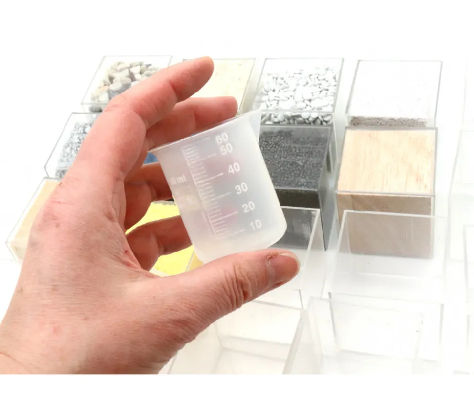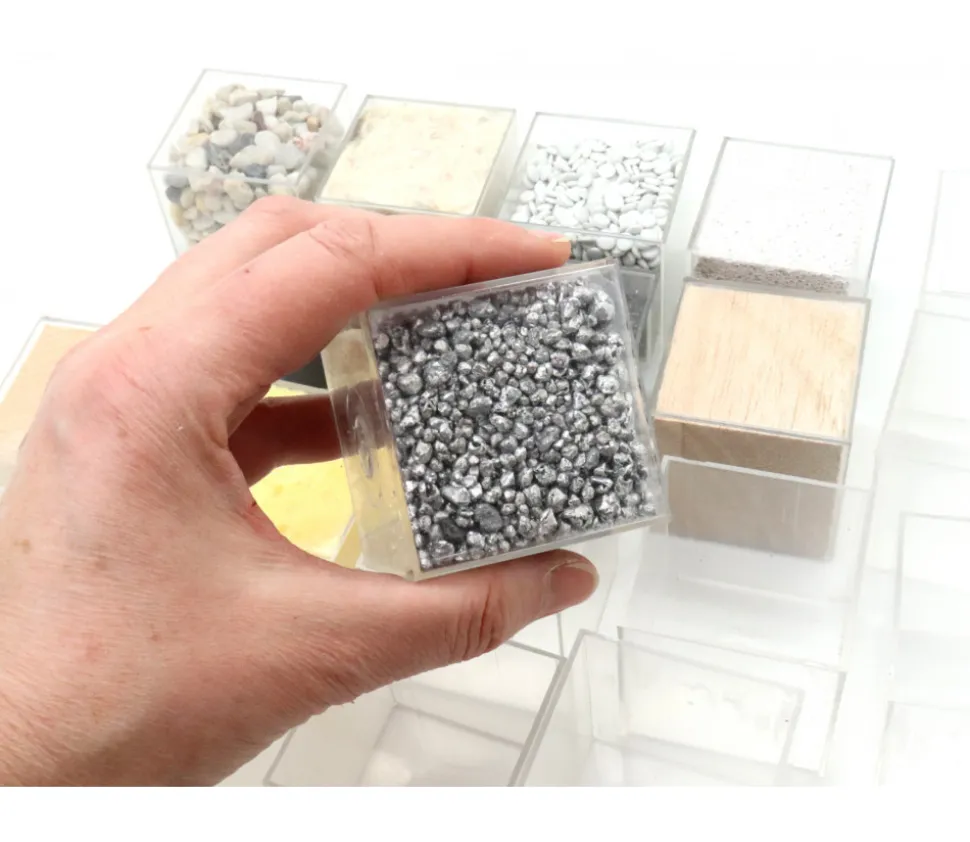 - 10 cubes plastique de 5 x 5 x 5 cm avec des matières à l’intérieur (cubes scellés que vous ne pouvez pas ouvrir) : 1 cube aluminium 352 g, 1 cube pierre ponce 94 g, 1 cube plume 28 g, bois de balsa 42 g, 1 cube mousse 22 g, 1 cube avec des graviers 198 g,1 cube avec de la laine 30 g,1 cube rempli de bois d’épinette 74 g,1 cube plastique dur 184 g, 1 cube avec de l’acier 428 g (poids approximatif pouvant varier d’un coffret à un autre)