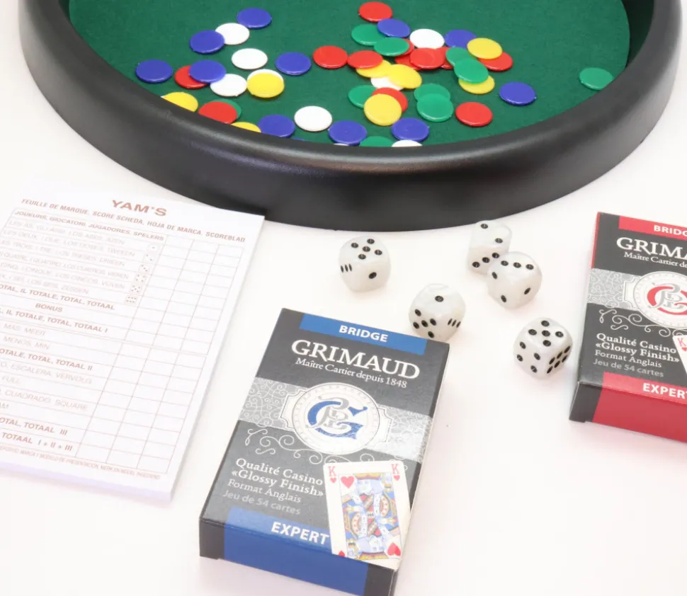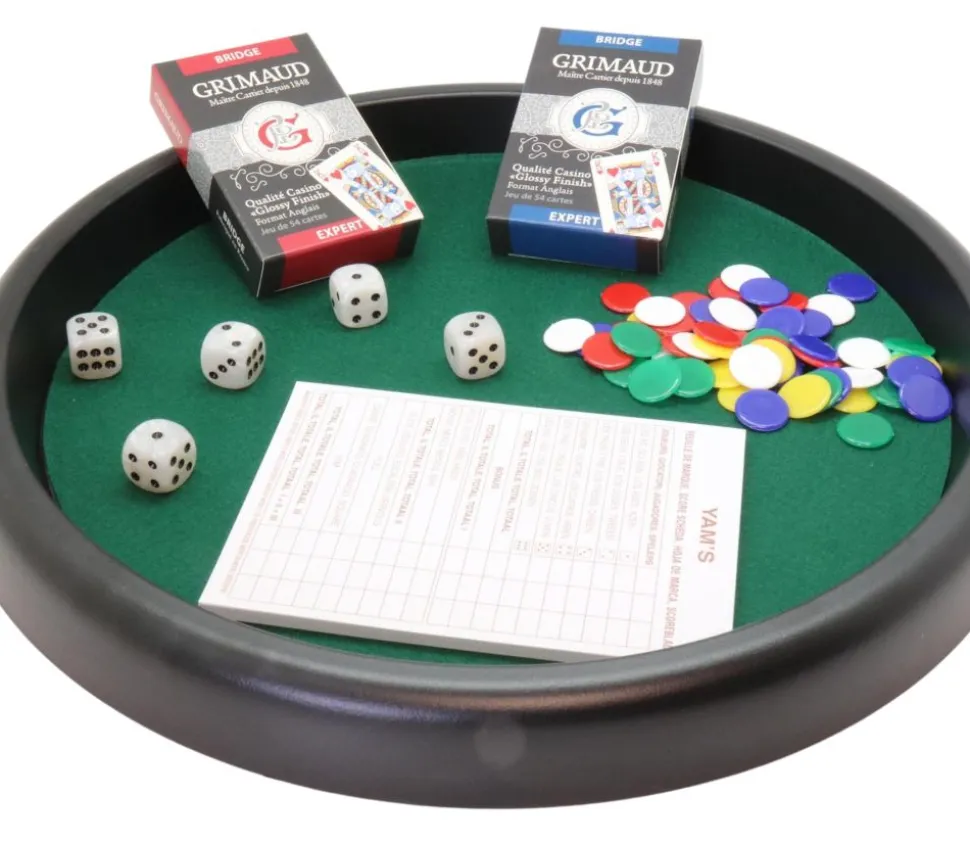 Un set de jeux tradition comprenant une piste de dés, 5 dés à jouer, 45 jetons, 2 jeux de 54 cartes à jouer, 1 bloc, de comptage des points, 1 sac tissu pour ranger tous les accessoires.