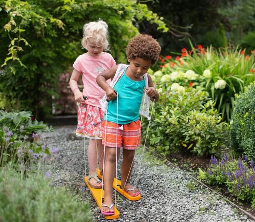 Ski de jardin de marche, jeu de motricité et de coordination d’extérieur où les enfants doivent apprendre à bouger ensemble pour faire avancer les skis.