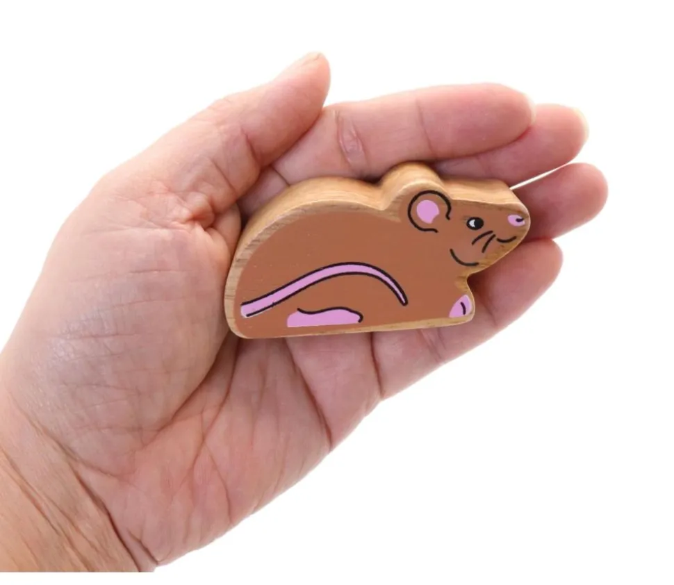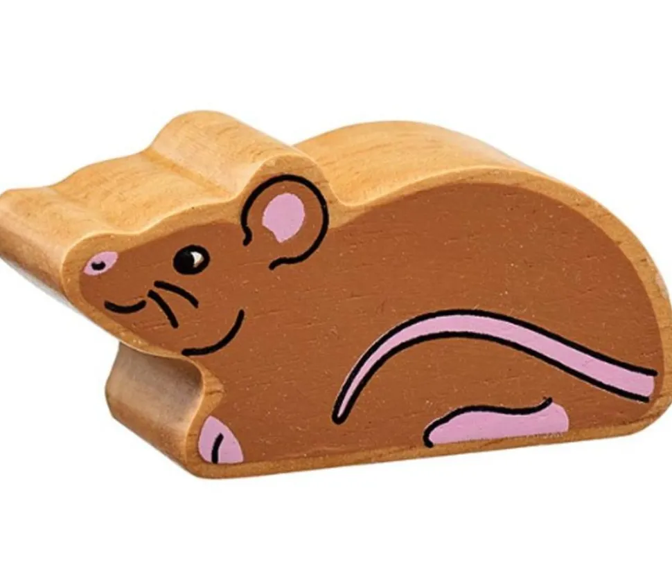 Gros pion souris en bois peint des deux cotés en marron et rose avec les traits soulignant le museau, les yeux, les oreilles, les moustaches en noir d’une façon rigolote qui nous ferait presque aimer ce petit animal !
