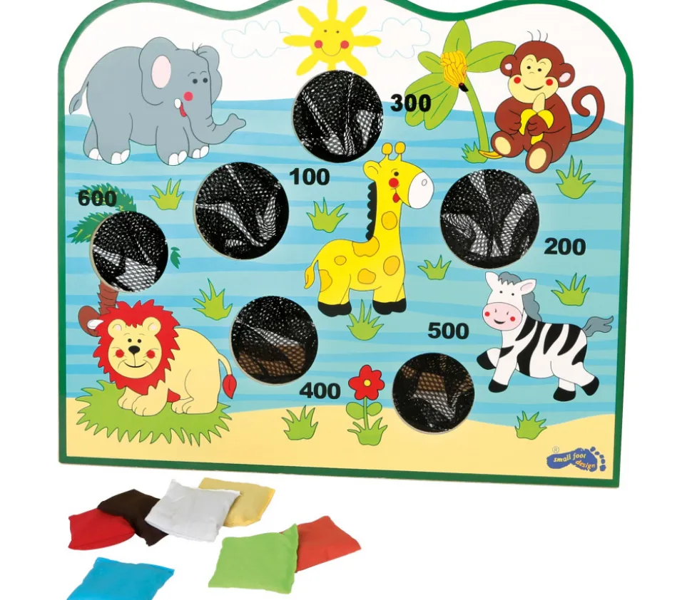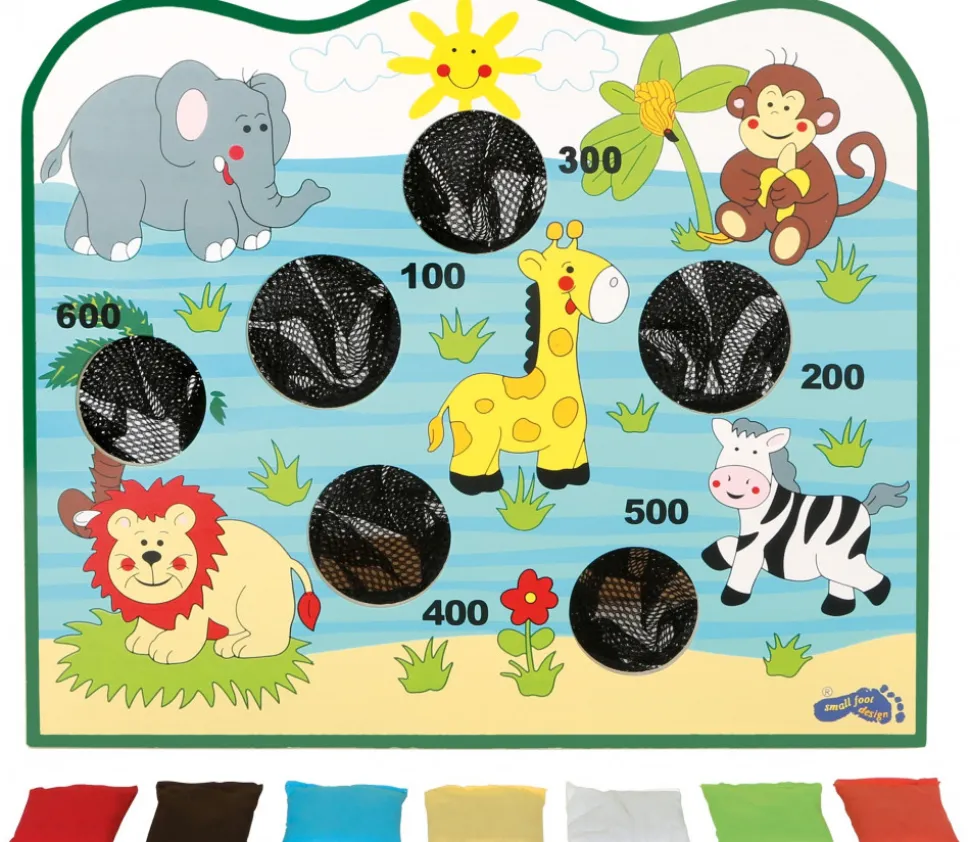 Jeu de lancer en bois 42 x 35 cm décoré avec les animaux d’Afrique. Jeu d’adresse où vous devez lancer les petits sacs dans les trous de la cible. Les trous rapportent un nombre de points différents de 100 à 600 points. Exercice d’apprentissage de coordination oeil-main et de motricité. Jeu en bois enfant coloré qui s’installe à la verticale. Livré avec 7 petits sacs de lancer.