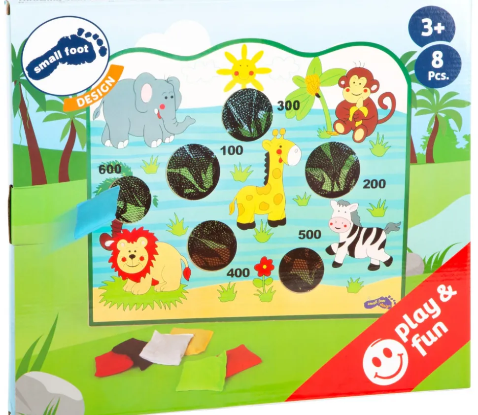 Jeu d’adresse en bois avec un grande cible verticale dans laquelle vous devez lancer des petits sacs de graine. Plateau de jeu en bois avec décorations de la Savane. Vous pouvez y jouer à l’intérieur ou à l’extérieur. Jouer seul ou à plusieurs en organisant des mini tournois. Qui aura le plus de points ?