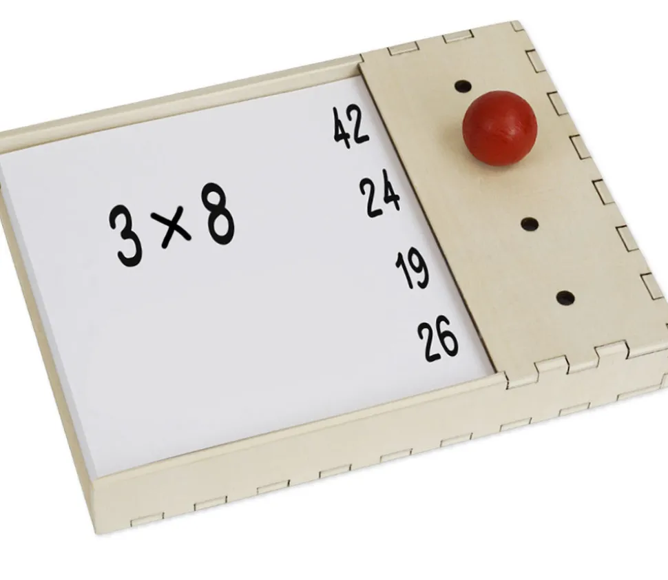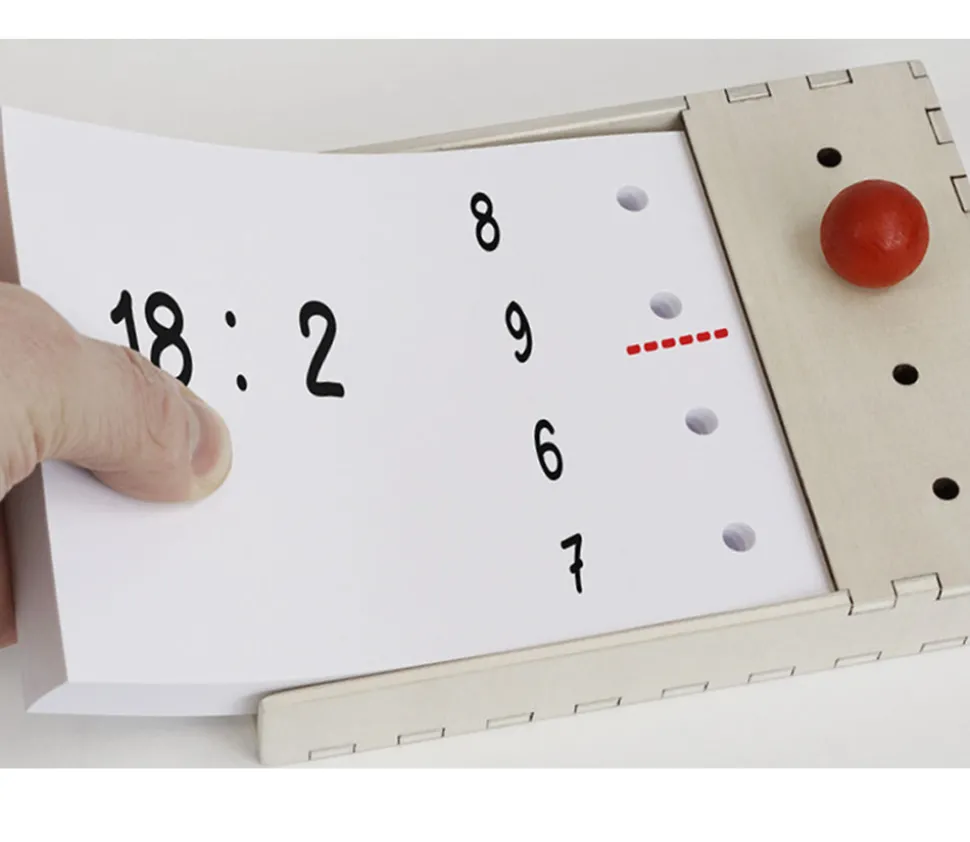 Insérer les cartes perforées dans le support de lecture en bois. Cet outil permet à l’élève de réviser en autonomie. Le support permet de valider ou non les réponses. L’enseignant a réglé les réponses en avance
