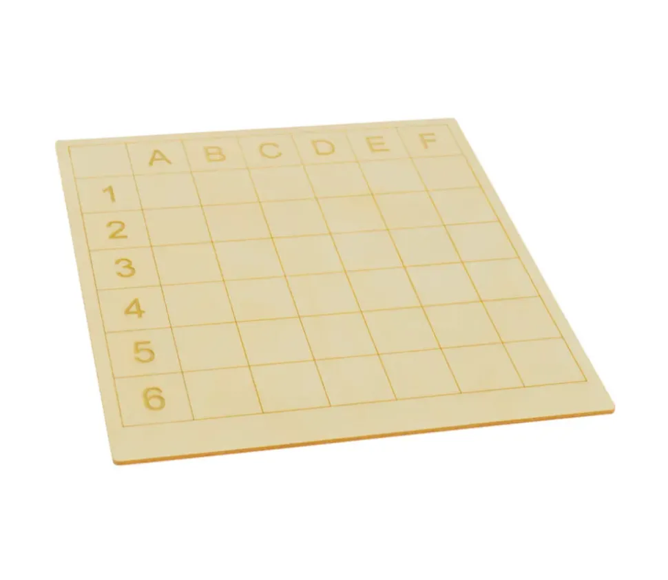 Plateau en bois naturel 24.5 x 26 cm avec des cases de 3.3 cm de coté. Epaisseur du contreplaqué : 3 mm