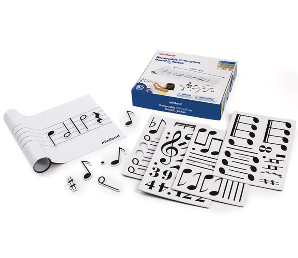 Une planche à musique avec des bâtons dont le dos adhère à toute surface plane. Comme il est amovible et réutilisable, vous pouvez le poser et le retirer aussi souvent que nécessaire, et vous pouvez être assuré qu’il ne laissera aucun résidu. Il comprend 85 figures musicales magnétiques pour créer des compositions sur un pentagramme. Vous pouvez écrire dessus avec un marqueur effaçable (non inclus).
