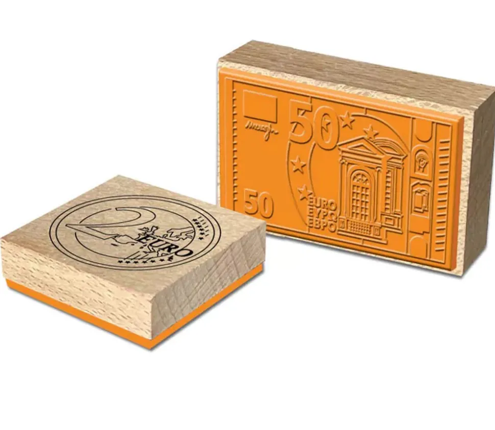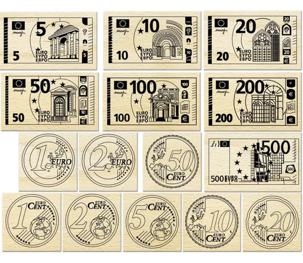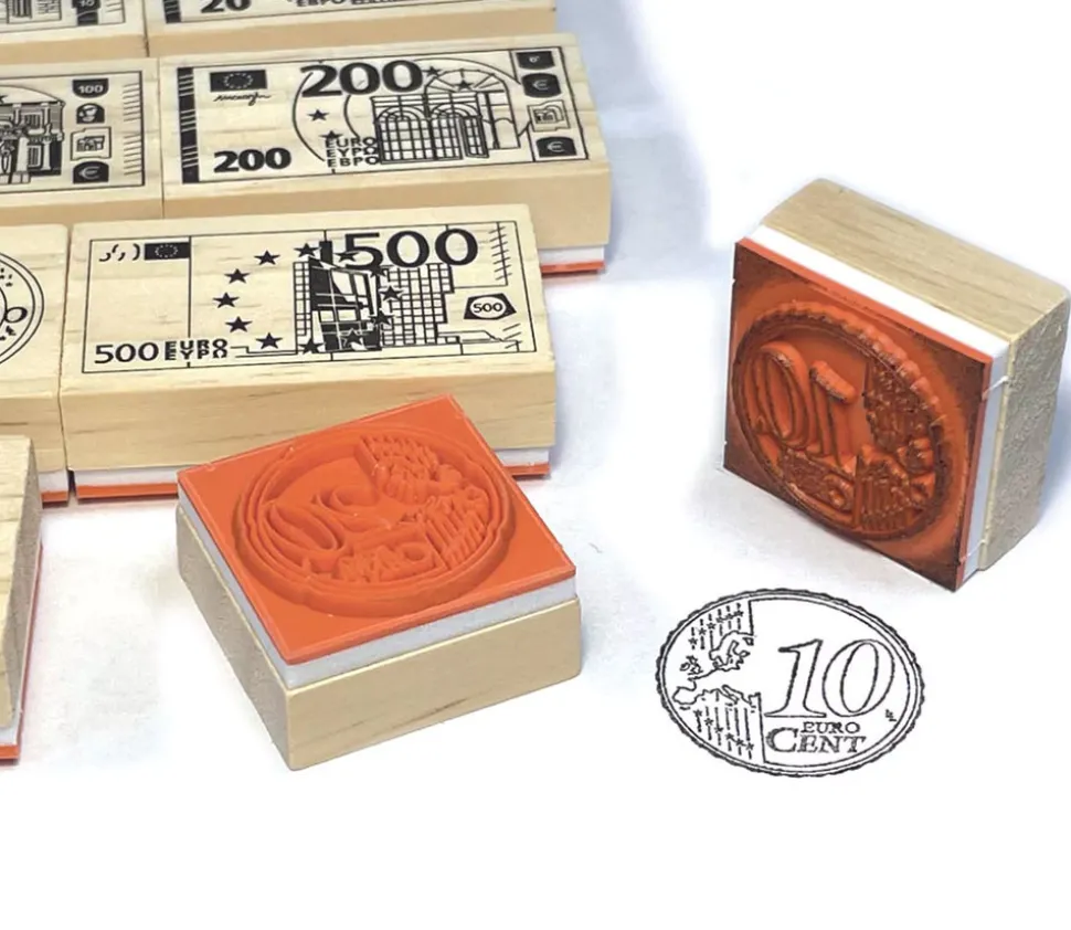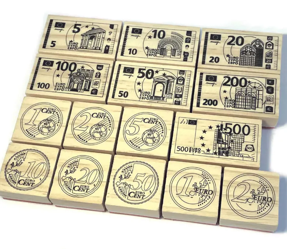 15 tampons euros pour les enfants. Set de tampons en bois avec les pièces de monnaie euros et les billets d’euros pour faire des jeux de conversions en mathématique avec vos élèves.