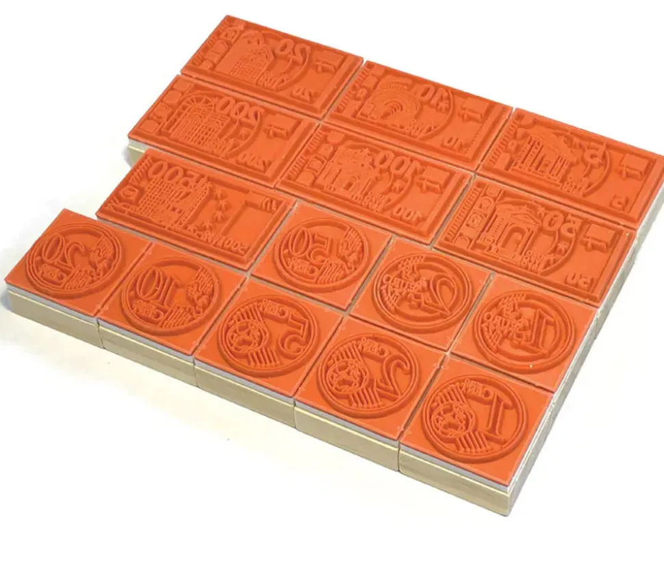 Set de 15 tampons en bois monnaie pour les mathématiques.