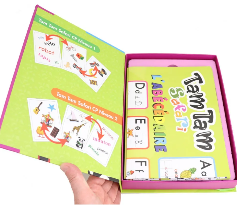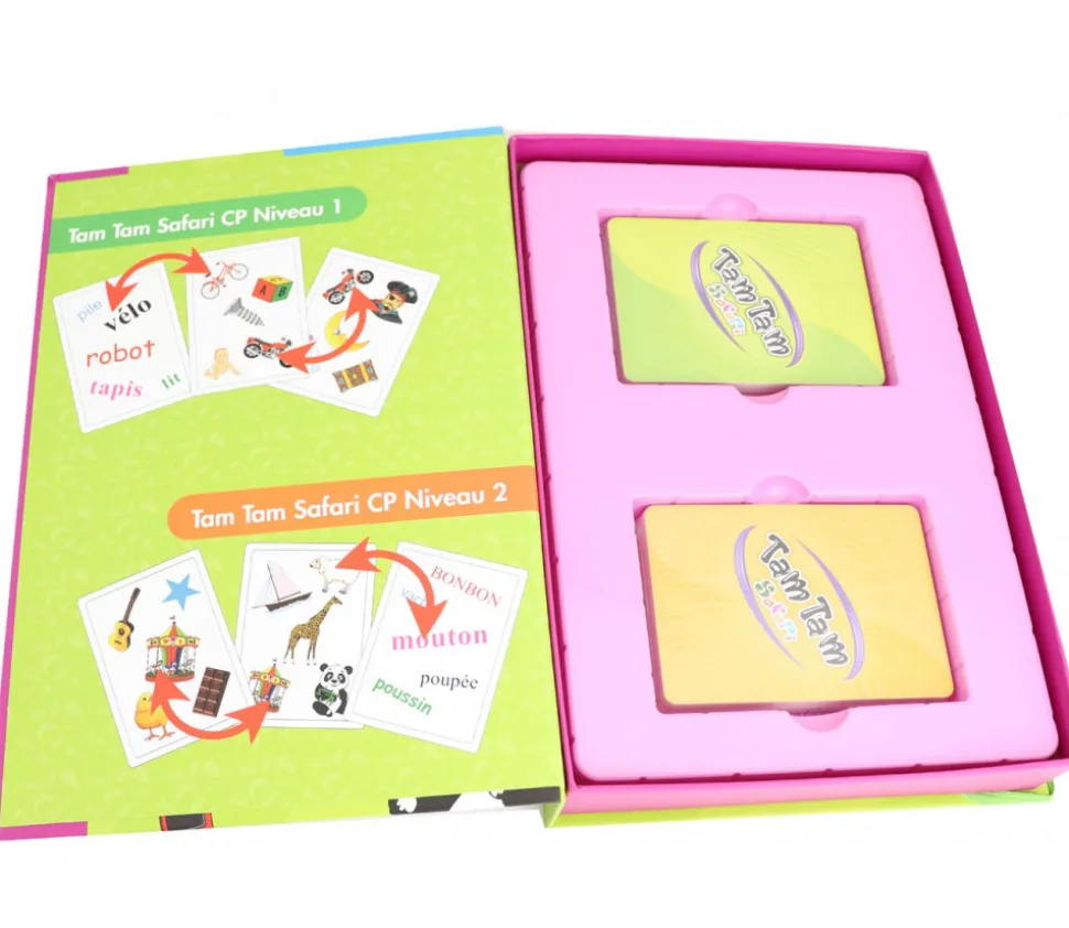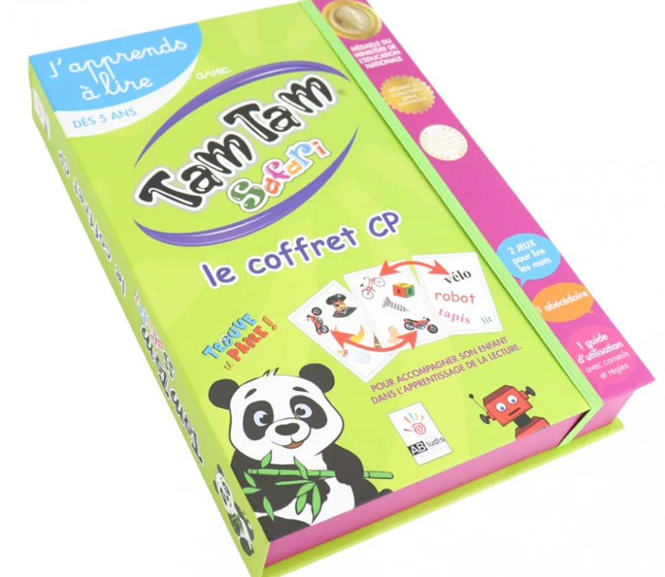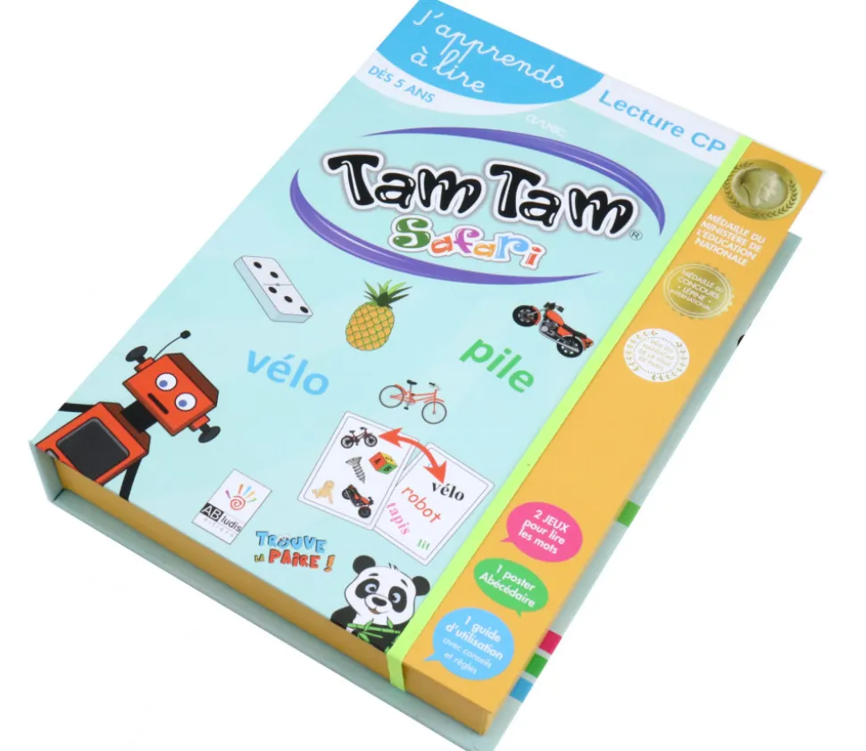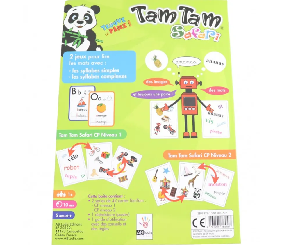 Coffret Tamtam Safari CP avec fiche poster abécédaire. 2 séries de 42 cartes : Cartes niveau 1 + niveau 2. Jeu de lecture simple et ludique. Outil d’aide à la lecture. Ce coffret complet 2 jeux : un pour manipuler les premiers sons simples (a de ananas, u de lune…) et l’autre les syllabes plus complexes (ou, on…). Jeu à partir de 5 ans. ABLUDIS EDITIONS. Jeu rapide 10 minutes.