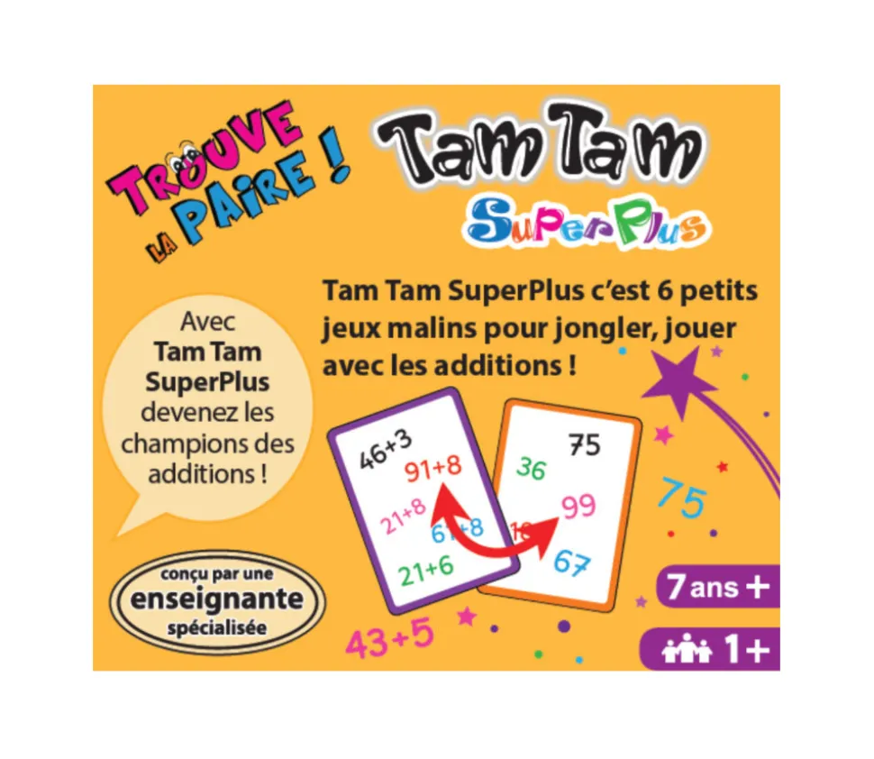 Jeu de cartes TamTam Superplus a+b avec les tables d’additions. Différentes règles proposées sur le principe de retrouver des paires. Retenir les tables devient plus facile. Ce jeu de mathématiques est idéal aussi pour améliorer l’automatisme et donc la mémorisation.