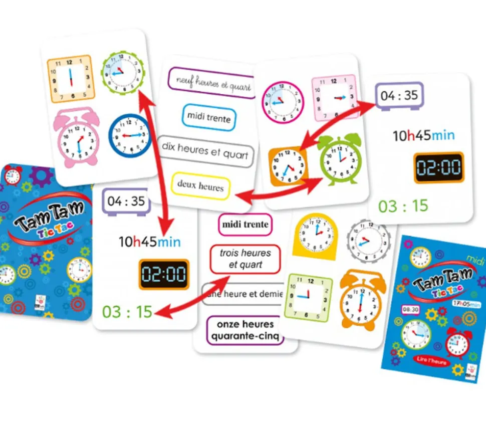 Le jeu Tamtam Tic Tac : principe retrouver les paires correspondants à la même heure. Un jeu d’observation pour jongler avec les différentes représentations de l’heure : analogique, littérale et digitale.