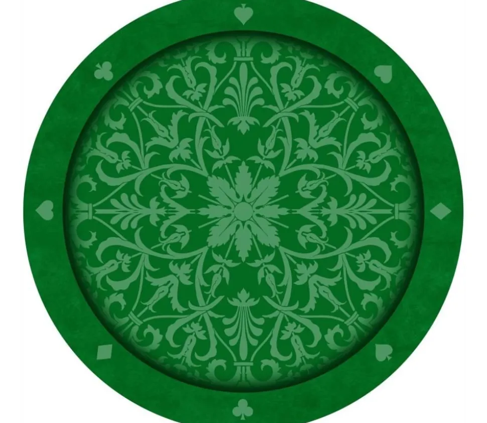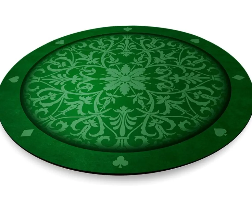 Magnifique Tapis de cartes à jouer vert de 60 cm de diamètre avec un motif d’arabesques imprimés en blanc.