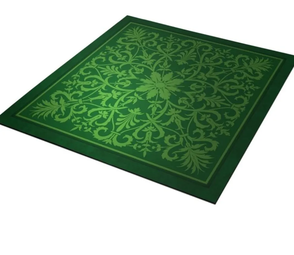 Tapis pour jeux de cartes fond vert et impression arabesques blanches.