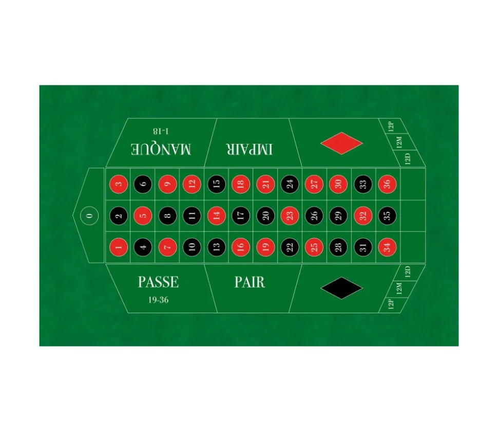 Tapis Roulette Française en Jersey néoprène avec les numéros de roulette, paires et impaires… Tout ce qu’il faut pour recréer l’ambiance du jeu de casino à la maison, dans un hôtel, une animation, centre de loisirs.