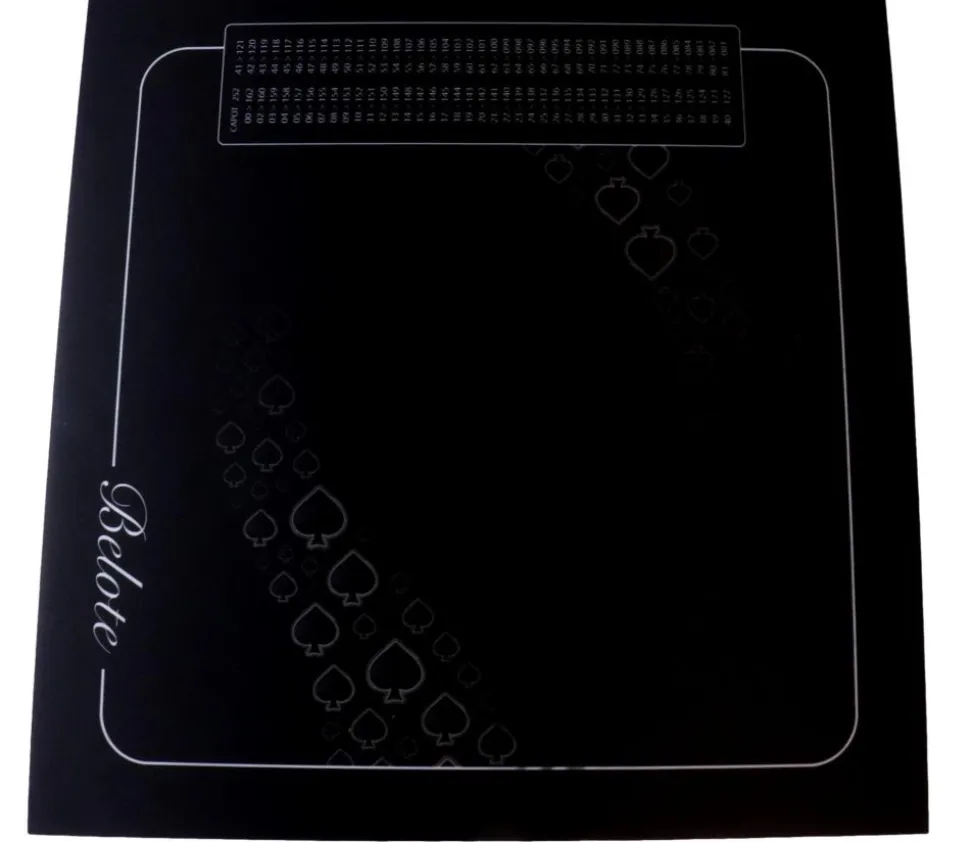 Tapis de jeu cartes Belote de 60 x 60 cm. Grand Tapis carré noir très agréable au toucher. Ce tapis pour jouer à vos jeux de cartes ou de rôle favoris : Belote, Tarot, jungle speed … Sa texture vous permet de ramasser plus facilement vos cartes et tient bien sur votre table de jeu, super qualité qui vous permet des tirages de dés parfaits.