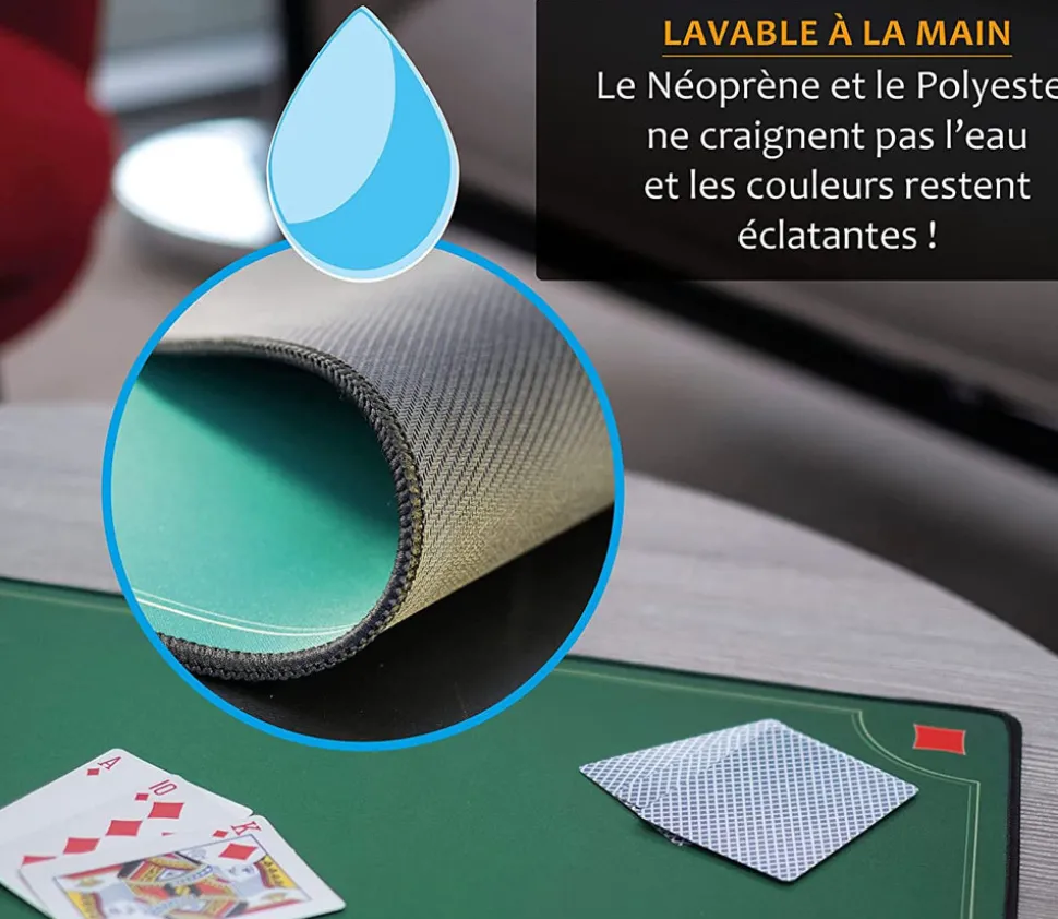 Parfaitement stable sur la table grâce à la face antidérapante en néoprène. La face pour le jeu est idéale pour la glisse des cartes.