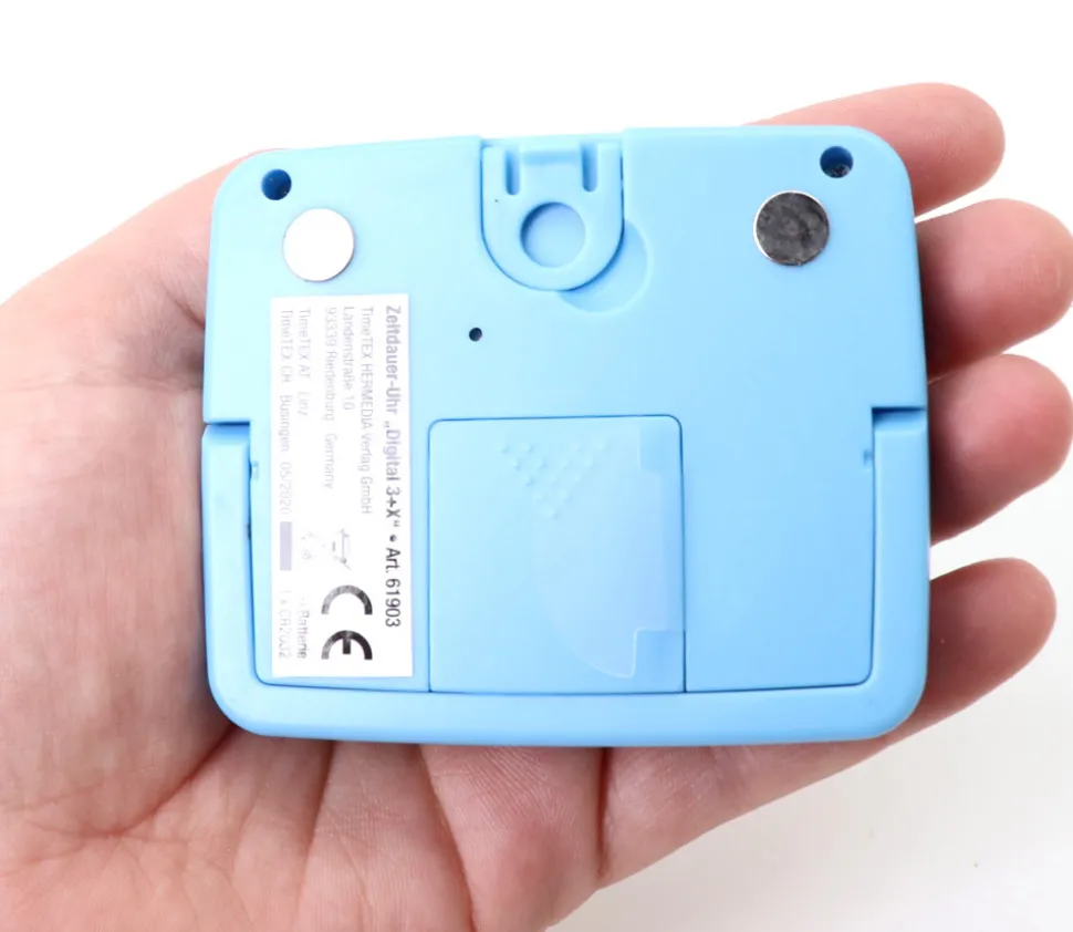 Minuteur en plastique bleu avec un socle rétractable pour le poser sur une table à la verticale et une attache à l’arrière pour le fixer au mur ou encore 2 aimants à l’arrière pour le fixer sur un tableau mural métallique.