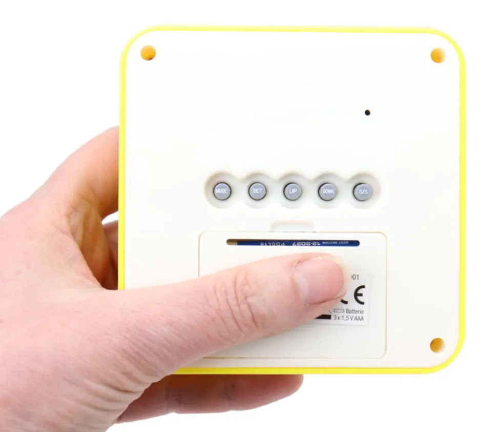 Pour la fonction Réveil, le réglage se fait en appuyant 2 fois sur ‘MODE’ puis ‘SET’ pour sélectionner heure ou minute puis ‘UP’ et ‘DOWN’ puis ‘SET’ pour valider. Et enfin 2 fois sur ‘MODE’ pour quitter le menu. Pour activer le réveil, positionner le Timer avec l’horloge vers le haut puis appuyer sur le bouton set, le symbole d’une cloche apparaît entre les heures et les minutes.