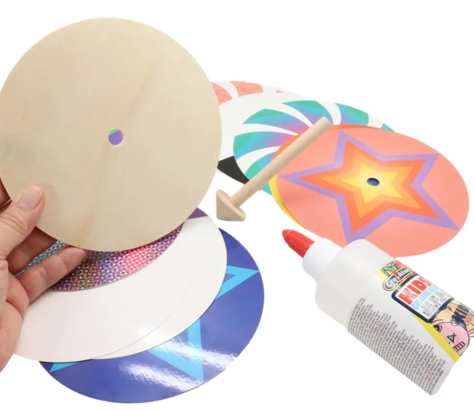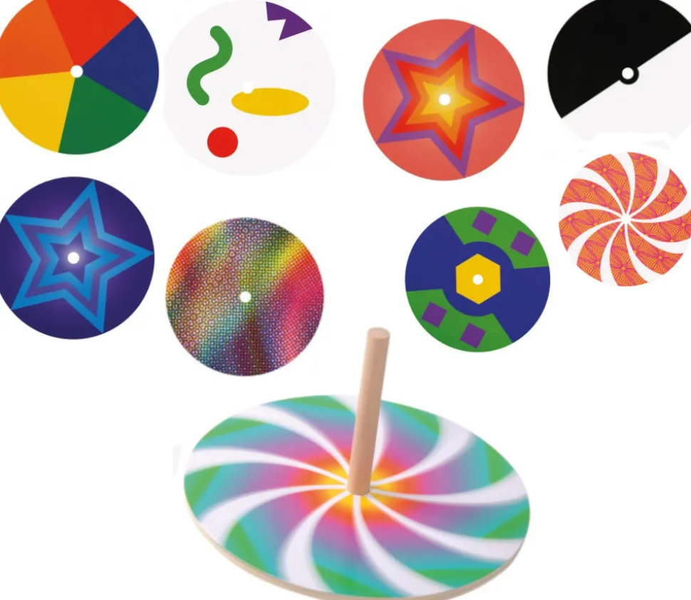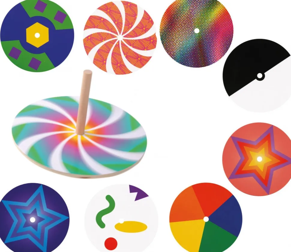 Toupie géante en bois avec fiches interchangeables pour observer mélange et changement de couleur avec la rotation. Grande toupie en bois de 15 cm de diamètre et 10 cm de haut à assembler. Facile à faire tourner même pour les petits. Glisser les fiches optiques sur la toupie et observer les modification de couleurs ou les effets liés au mouvement. Matériel pédagogique intéressant. Toupie livrée avec 10 fiches (9 fiches colorées et 1 fiche neutre à personnaliser).