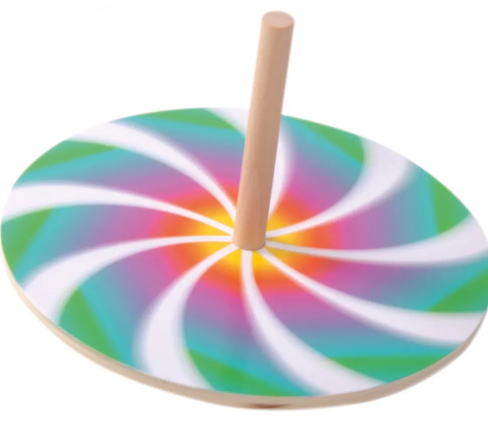 Grande toupie en bois mélange de couleurs. Toupie avec des effets optiques différents à observer.