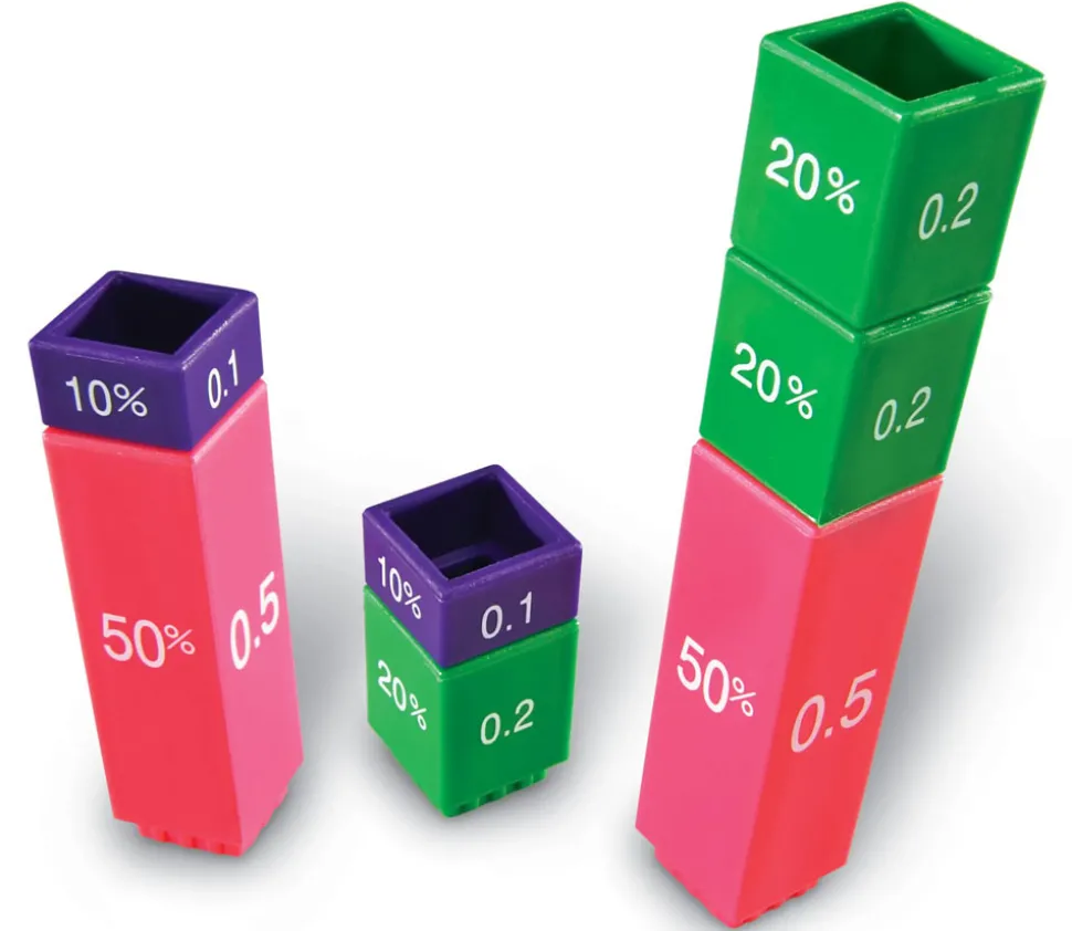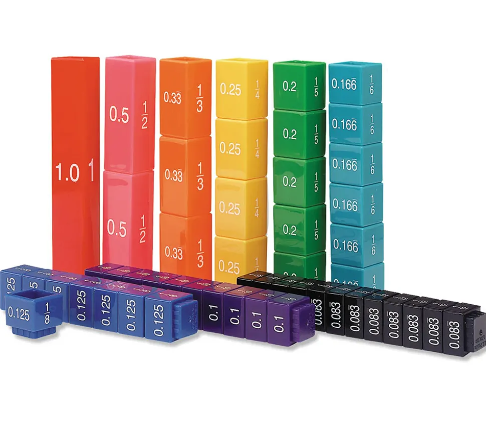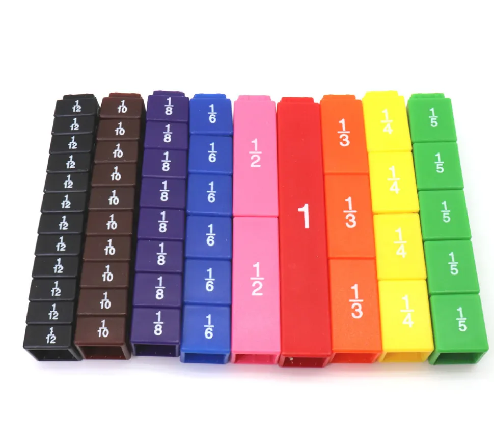 Set de gros cubes et barres de fractions pour apprendre les décompositions des premières fractions. Outil pédagogique avec pièces encastrables pour aborder les notions de fractions, pourcentages, portions, parts, nombres décimaux…