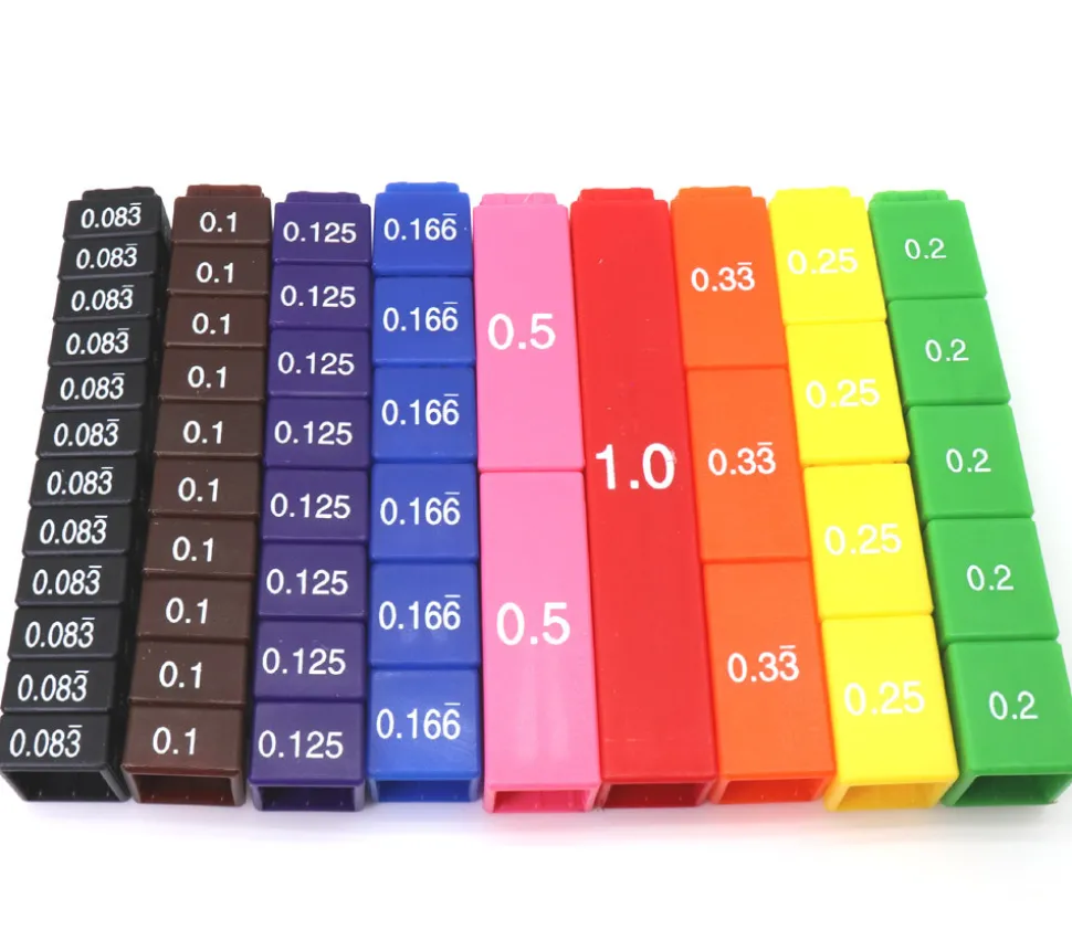 51 pièces fractions de 1/1 à 1/10 de 9 couleurs différentes. Cubes emboitables pour travailler les équivalences en mathématiques.