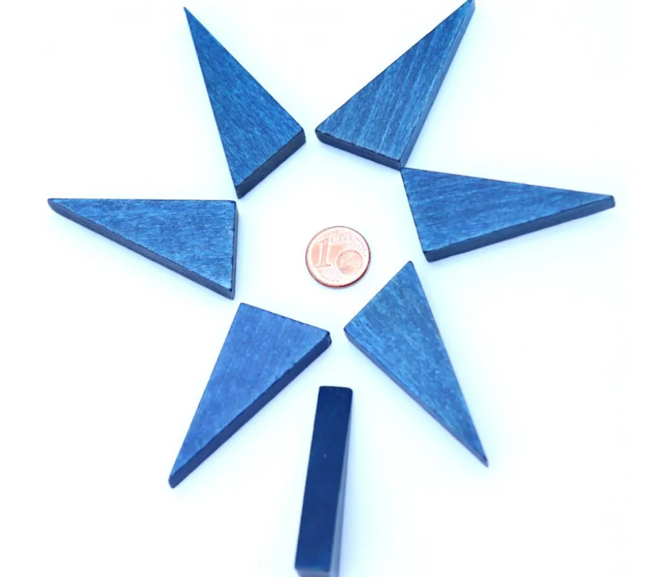 Pièces triangulaires en bois hêtre teinté en bleu. Triangles pions de 4.5 x 2.4 cm environ. Epaisseur : 8 mm.