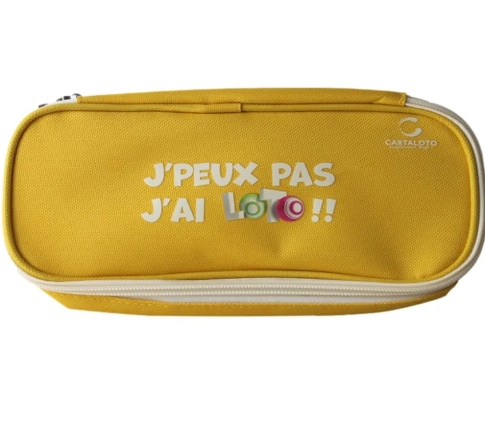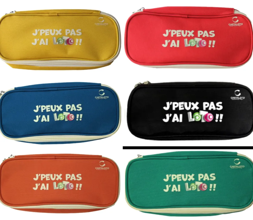 Trousse bingo en toile nylon résistante colorée avec impression en couleur de Bingo et message : « I ❤ Bingo » ou « j’peux pas j’ai loto » (mis aléatoirement selon disponibilité)