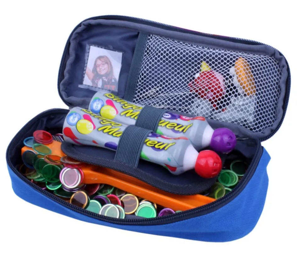 Trousse de rangement avec fermeture éclair pour ranger vos accessoires de jeux de loto ou de bingo. Différentes couleurs disponibles à choisir : bleu, rouge, rose ou vert. Format : 22 x 13 x 6 cm.