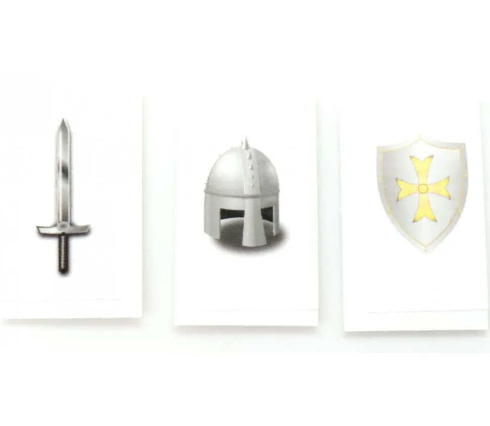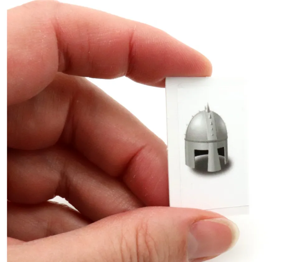 Tuile cartonnée rectangulaire blanche avec un dessin coloré recto et verso identique représentant un casque de chevalier. Jeton pour jeux de chevalerie, moyen-âge ou stratégie. Supports cartonné de 2.4 x 4 cm avec casque en couleur au recto et verso (épaisseur 2 mm). Rigide ces tuiles jetons peuvent être utilisé comme marque de reconnaissance pour les joueurs, comme récompense, comme repérage des différents équipes, cartes de protection. Vous pouvez les utiliser à la verticale comme pion de jeu en les combinant avec des supports de pions.