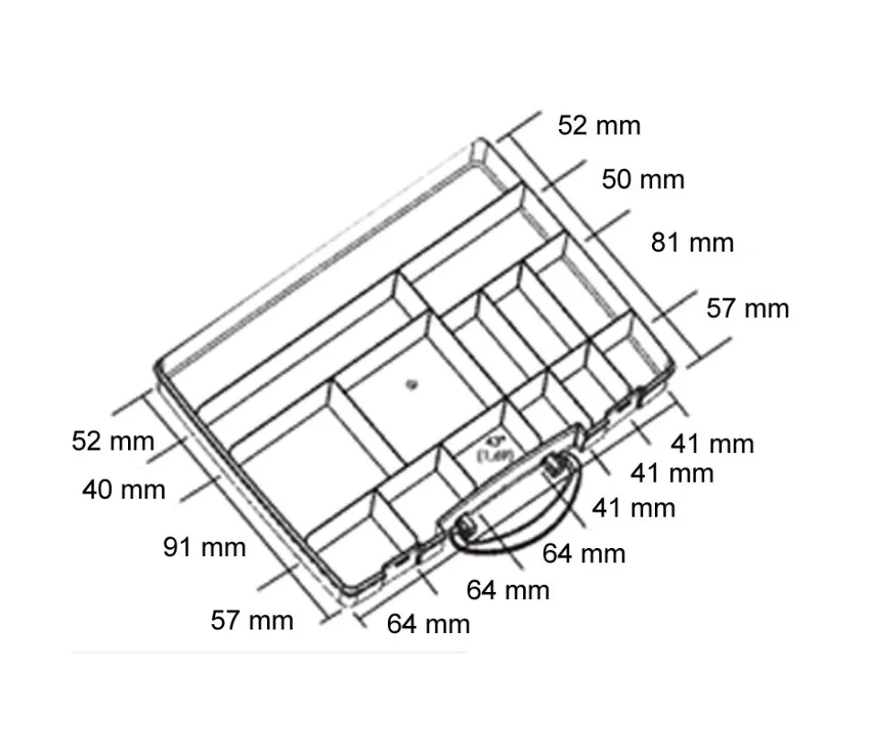 Dimensions extérieures : 325 x 255 x 56 mm (pour les dimensions intérieures des casiers, nous vous invitons à voir l’image avec les dimensions).