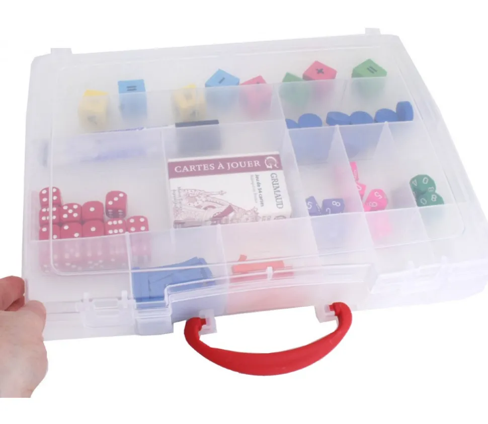 Boite valise de jeux neutre en plastique rigide grand format avec 14 compartiments de tailles différentes pour ranger vos accessoires de jeux de société. Valisette transparente pratique avec ses casiers. Grande boite valise en polypropylène transparent avec une poignée rouge. Valisette avec possibilité des les attacher ensemble.